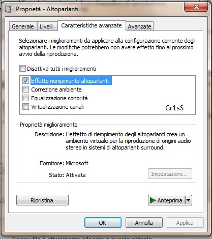 Raggiungete il percorso: Pannello di controllo / Audio / Altoparlanti / Proprietà, quindi: